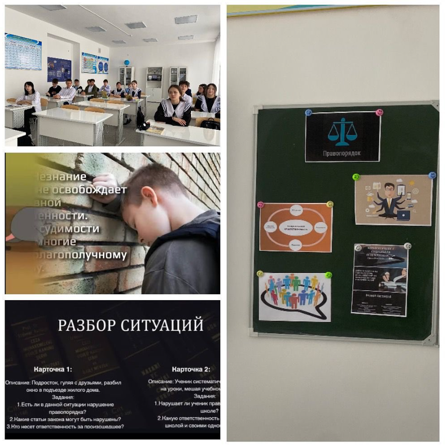 9А-сыныпта «құқықтық тәртіп және әлеуметтік жауапкершілік»тақырыбында сынып сағаты өтті. Балалар қоғамдағы заңдар мен жеке жауапкершілікті сақтаудың маңыздылығын талқылады. Нақты жағдайлардың мысалдарын қолдана отырып, олар құқық бұзушылықтардың салдарын талдады. Викторина барысында оқушылар азаматтардың құқықтары мен міндеттеріне қатысты сұрақтарға жауап берді. Сабақ соңында оқушылар қоғамда жауапкершілікті қалай сақтау және құқықтық тәртіпті сақтау туралы ойларымен бөлісті.