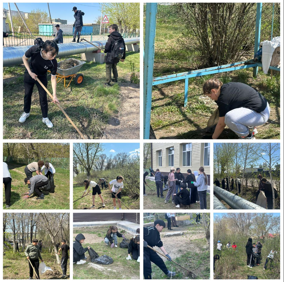 Қажетті құрал-жабдықтармен қаруланған балалар мен мұғалімдер мектеп аумағын ретке келтірді. Қоқыс пен құрғақ жапырақтарды тазарту жұмыстары жүргізілді.