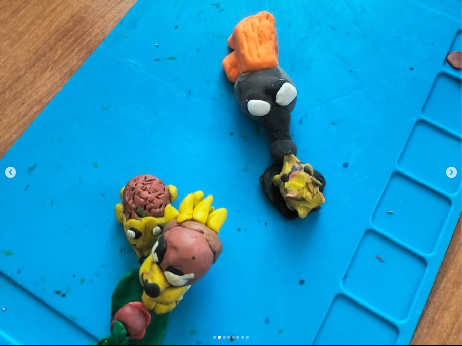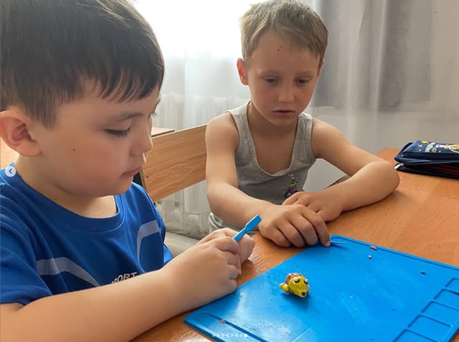 Шығармашылық сабақ кірпіні мүсіндеуге арналды. Кішкентай мүсіншілер өздерінің сазды достарын құмарлықпен жасады. Балалар шарлар мен шұжықтарды қалыптастыруды, бөлшектерді біріктіруді және қолөнерін безендіруді үйренді. Модельдеу ұсақ моториканы, қиялды және шығармашылық ойлауды дамытады.